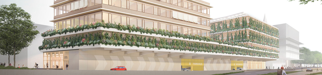 Was entsteht? Ein Gebäudeensemble, bestehend aus einem Parkhaus mit umfassenden Mobilitätsangeboten sowie einem Gebäudeteil mit flexibel nutzbaren Gewerbeflächen für Gastronomie, Handel und Arbeiten. Ein öffentlich zugänglicher Dachgarten rundet das Ensemble ab.
